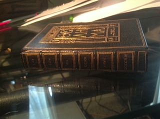 Below are photographs of the book’s binding and the page with the correction to Liber Legis. These photos are just quick snapshots taken before rushing the book into safe deposit—I don’t care to have such valuable Order property around on an ongoing basis.