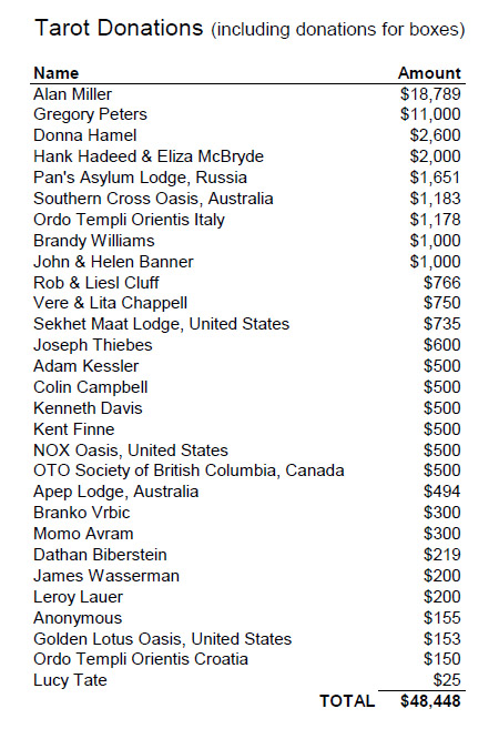 I am incredibly proud of O.T.O. as an organization, and of my brothers and sisters who gave so generously. Thank you all—and thanks to Treasurer General Vere Chappell for coordinating the fundraising.