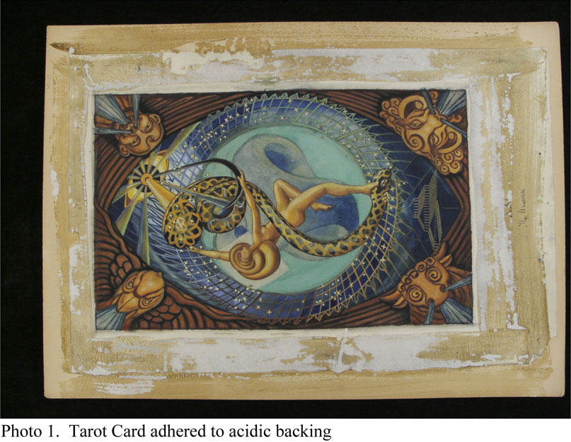 The window mats were removed from each card, the adhesive residues removed and the mats were lined with thin, museum quality, acid-free matboard, to provide a barrier between said window mat and the Tarot card itself. The edges of the mats were repaired and consolidated where necessary.